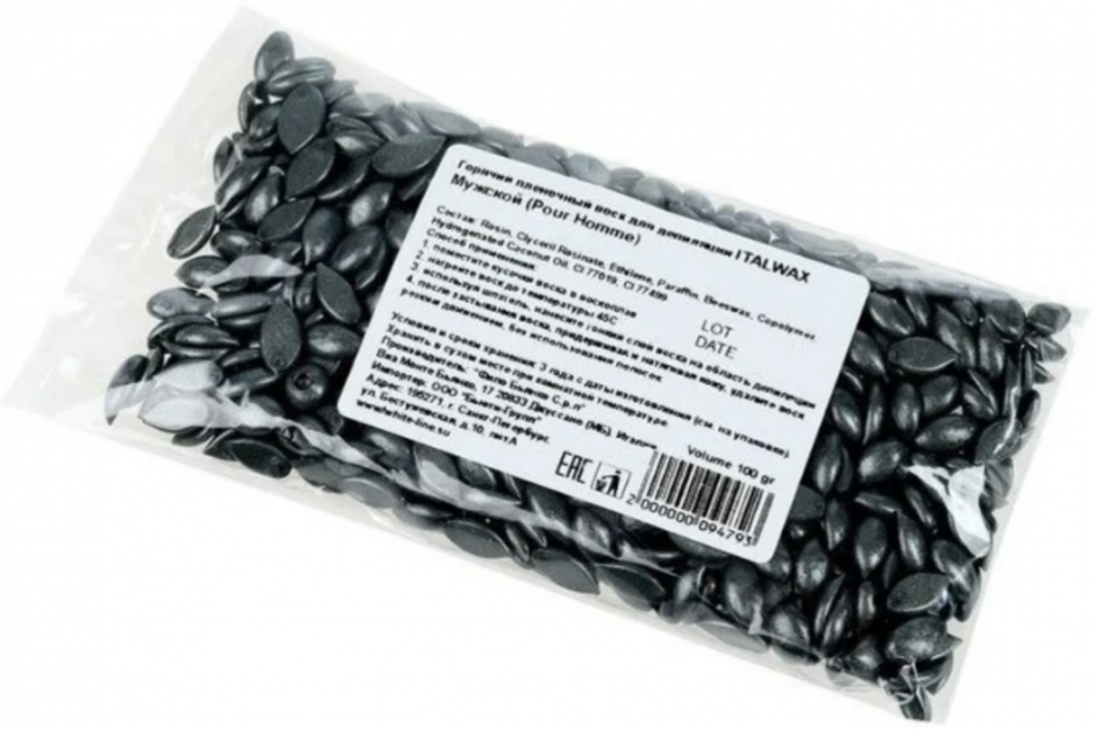Особая формула воска разработана специально для депиляции мужчин:повышенное сцепление с жесткими мужскими волосами; 100% удаление волос с первого раза;минимум болевых ощущений;не травмирует кожу;наносится шпателем в любом направлении без учета роста волос, снимается без полосок;применяется для удаления волос на груди, спине, в зоне лица, подмышек и бикини, коррекции усов, бороды, бровей, придания четкого контура прическе.Пленочные воски для депиляции ITALWAX — это улучшенный вариант горячего воска. За счет введения в состав специальных компонентов воски обладают особыми свойствами и преимуществами:работают при + 42°С, что исключает возможность ожога;наносятся воски шпателем тонким слоем, без учета направления роста волос;четко повторяют контуры тела, т.к. отличаются высокой пластичностью, позволяя продепилировать труднодоступные зоны с первого раза;за счет длительного теплового воздействия (5–12 секунд) воски хорошо распаривают кожу, захватывают каждые, даже короткие и жесткие волоски, и только после этого застывают;снимаются воски пленкой, удаляя полностью все волоски с корешками, не оставляют после себя обломанных волос, раздражений и покраснений на коже;экономичны в использовании, с подмышки можно удалить волоски одной аппликацией. Уменьшают расход средств примерно на 30%.Правила использования пленочного воска ITALWAX:разогрейте воск в электронагревателе до t + 42°С;зону депиляции обработайте спиртосодержащим лосьоном;нанесите небольшое количество талька;нанесите шпателем тонкий слой воска независимо от направления роста волос, но по направлению к себе, оставляя небольшой «лепесток», за который потом можно будет ухватиться (подмышку стараемся депилировать одной аппликацией).ВНИМАНИЕ! Наносите не торопясь, тщательно нажимайте на шпатель, прикладывая необходимые усилия. Воск застынет через 5-6 секунд (готовый к удалению воск не должен липнуть к руке при касании).Предварительно натянув кожу в направлении, противоположном отрыву, резким движением удалите воск в направлении от себя параллельно коже. Повторите процедуру на следующем участке.После окончания депиляции обработайте кожу успокаивающим, охлаждающим, не содержащим масел, средством.Основные ошибки при использовании пленочного воска:воск тянется, как карамель и плохо снимается;причина: воск не успел застыть;решение: подсушите воск тальком, подождите 2-3 секунды и удалите;после удаления воска остались волоски;причина: шпатель с воском недостаточно прижимали к коже, поэтому волоски не попали в слой воска;решение: нанесите воск на участок кожи с оставшимися волосками, плотнее прижимая шпатель к зоне депиляции;после удаления воск по краям аппликации остается на коже;причина: неравномерное нанесение воска;решение: сформируйте аппликацию с одинаковым слоем по середине и по краям.