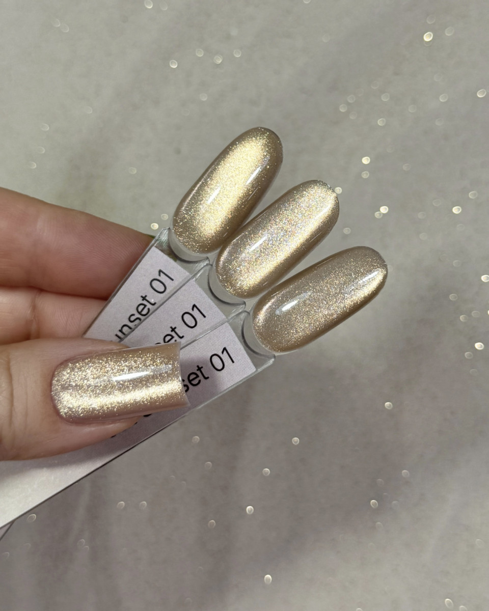 Sunset Cat — всё, за что мы любим лето.За блик, который играет на ногтях, как солнце.За оттенки, которые хочется рассматривать снова и снова — как закат.За то, что даже нюд может светиться, если это кошка.Sunset Cat-три блика, три настроения: Sunset Cat 01 — бежевый Sunset Cat 02 — золотой Sunset Cat 03 — розовыйМягкие, светлые, с бликом, который можно собрать в любую форму.Ложатся в один слой, можно без подложки.