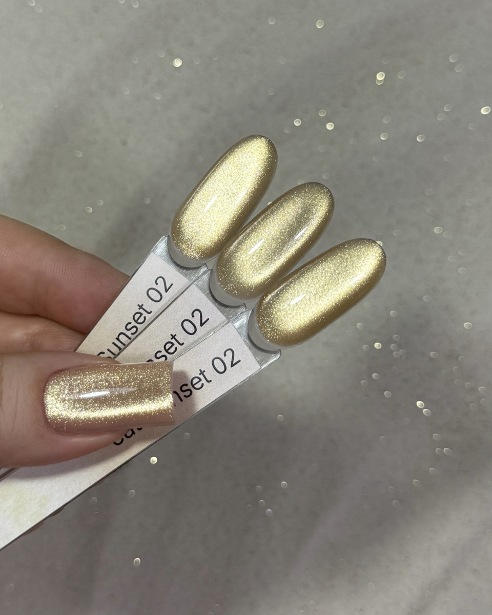 Sunset Cat — всё, за что мы любим лето.За блик, который играет на ногтях, как солнце.За оттенки, которые хочется рассматривать снова и снова — как закат.За то, что даже нюд может светиться, если это кошка.Sunset Cat-три блика, три настроения: Sunset Cat 01 — бежевый Sunset Cat 02 — золотой Sunset Cat 03 — розовыйМягкие, светлые, с бликом, который можно собрать в любую форму.Ложатся в один слой, можно без подложки.
