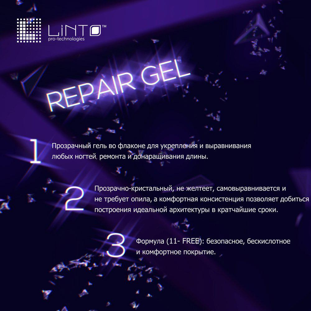 REPAIR GEL LiNTOГипоаллергенный продукт 11-FREE (Не содержит: FORMALDEHYDE, TOLUENE, DBP, FORMALDEHYDE RESIN, CAMPHOR, XYLENE, ETHYL TOSYLAMIDE, PARABENS, ACETONE, HEXYLAMINE ALDEHYDE, BUTANONE)Прозрачный гель во флаконе для укрепления и выравнивания любых ногтей, ремонта и донаращивания длины.Обеспечивает стойкость маникюра к любым механическим воздействиям.Прозрачно-кристальный, не желтеет, самовыравнивается и не требует опила, а комфортная консистенция позволяет добиться построения идеальной архитектуры в кратчайшие сроки.Объём: 15 ml.