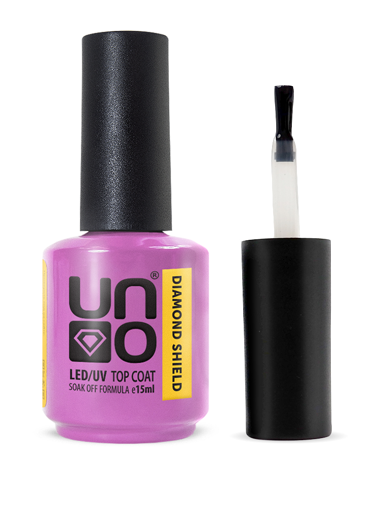 Верхнее глянцевое покрытие без липкого слоя UNO DIAMOND SHIELD:Обладает средне-вязкой консистенцией, легко самовыравнивается.Придает цветному покрытию великолепный ультраглянцевый блеск!Инновационная формула без УФ-фильтров в составе топа сохраняет цветные оттенки гель-лака без искажений. Оттенки остаются чистыми, без синих тонов и желтизны.Не имеет остаточного липкого (дисперсионного) слоя после полимеризации в UV/LED лампе.Обеспечивает защиту цветного покрытия от сколов и царапин до 4-х недель.Представлен в удобном объеме — 16 мл.