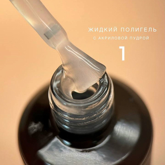 Жидкий полигель с акриловой пудрой.Жесткий, прочный, подходит для укрепления,верхних и нижних форм. Акриловая пудра в составе придаетдополнительную прочность, можно моделировать тонкиеногти и не бояться поломок. Наносить на подложку из прозрачной базы. Сушить 2 минуты
