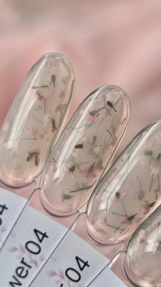 Обновление коллекции Flower Gel — добавлен оттенок №04:— полупрозрачный молочный тон— натуральные сухоцветы внутри— гель с лёгким белым подтоном, без ярко выраженного цвета