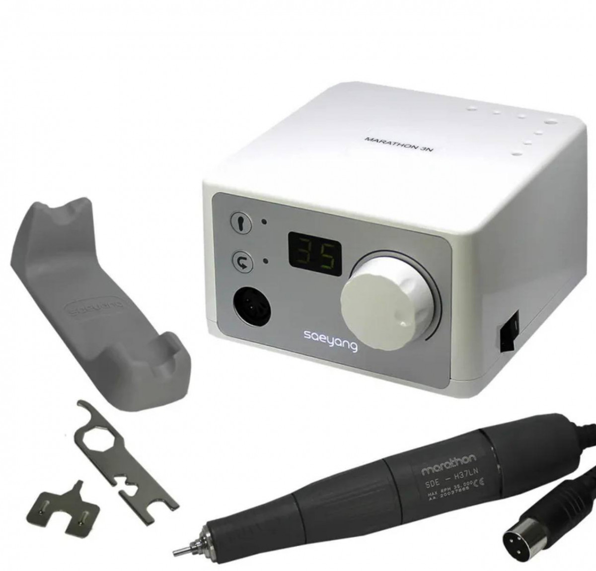 Фрезер Marathon 3N/H37LNВ комплект аппарата входят:блок управления Marathon 3N:● плавное регулирование скорости 0-35000 об./мин.;● функция реверса (на скорости);● функция автоматической остановки при перегрузке;● сенсорное управление;● цифровая индикация скорости вращения;● функция автокруиза;● отверстия для фрез;наконечник SDE - H37LN:(154мм*28мм) вес - 208 гр;крутящий момент 3,2 Нсм;скорость вращения 0-35000 об/мин;полное отсутствие нагрева и вибрации.Технические характеристики:блок управления Marathon 3N:(120мм*120мм*75мм), вес - 1130 гр.;питание - АС 110/220V;максимальная мощность 40 Ватт;функция реверса на скорости;функция автоматической остановки при перегрузке;