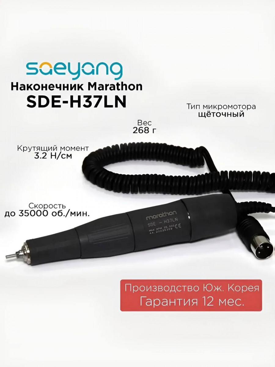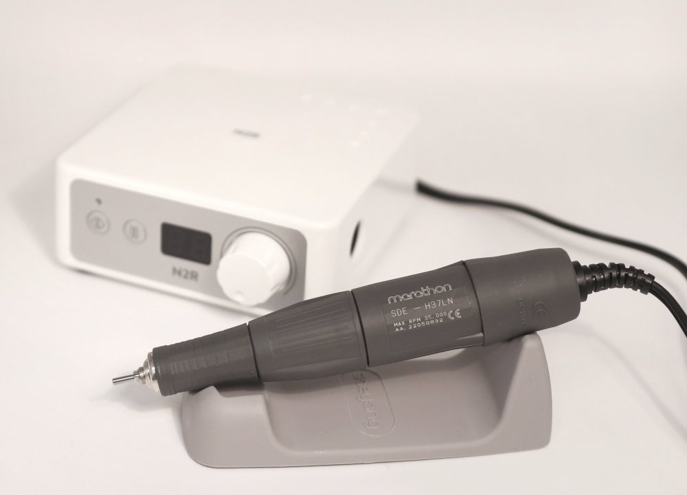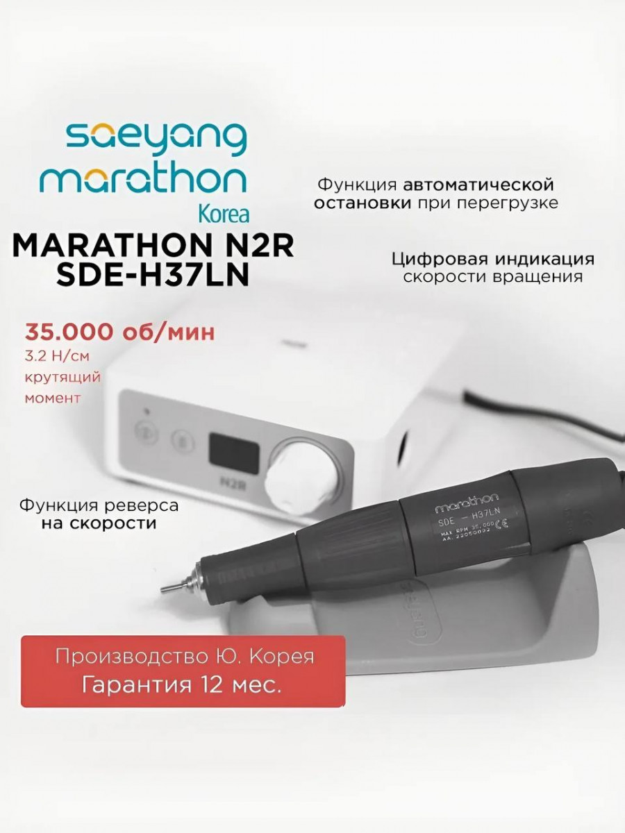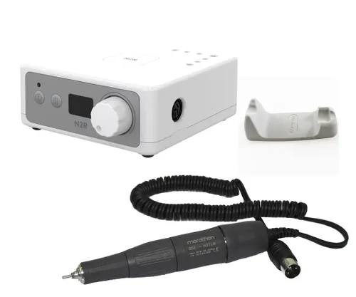 Абсолютно новый аппарат для маникюра - Marathon N2R! Marathon N2R высокотехнологичный аппарат для маникюра!Самая компактная и легкая модель в серии аппаратов Marathon! Цифровая индикация позволяет точно задать скорость вращения инструмента. Блок управления имеет электронную защиту от перегрузок. В аппарате Marathon N2R можно переключать реверс на ходу. Отверстия на корпусе – для хранения фрез. Аппарат имеет 2 режима работы «Ручной» и «От педали».Аппарат комплектуется наконечником-микромотором Marathon SDE-H37LN. Максимальная скорость вращения 35 000 оборотов в минуту. Крутящий момент наконечника составляет 3,2 Н*см. Длина наконечника 154 мм, диаметр 29 мм. Вес 210 гр. Длина провода 1,5 метра.