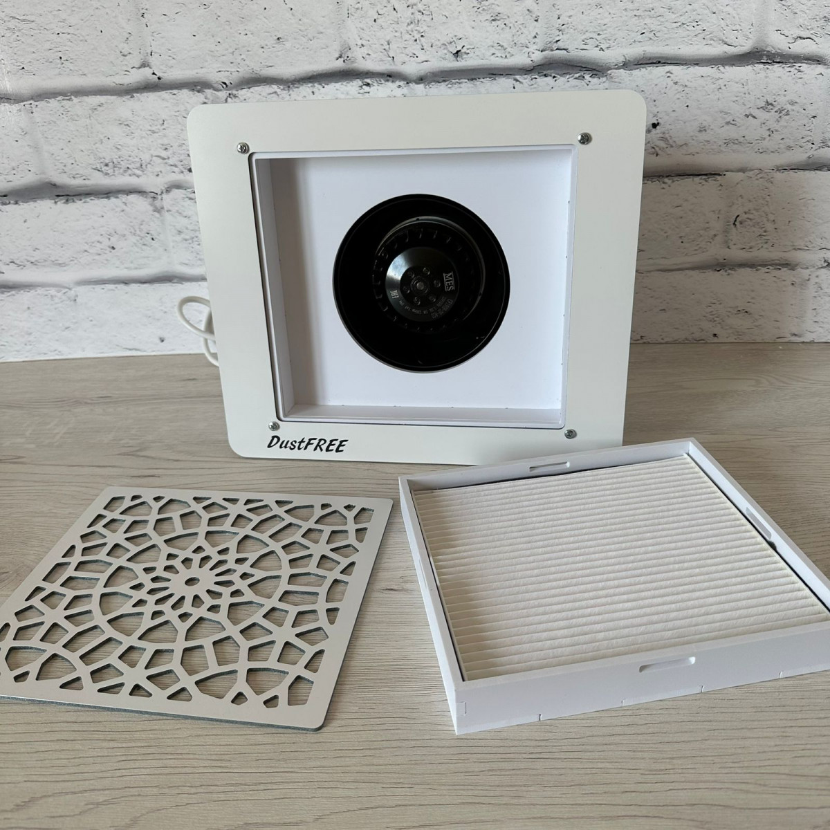 Готов к работе «из коробки» — не требуется дополнительной сборки. Достаточно вырезать отверстие в столе. На полную установку с момента распаковки уходит не более 10 минутБлагодаря мощности воздушного потока, появилась возможность использовать салфетки из нетканной синтетики в качестве дополнительных фильтровПростота в обслуживании — для очистки фильтра требуется несколько легких движений, нет необходимости лезть под столЦельный корпус — никаких «ручейков» пыли и подсасывания воздуха. Только 100% полезной работы.— [ ] Сменный фильтр тонкой очистки— [ ] Большая площадь и высота захвата— [ ] Канальный двигатель, с удлиненными лопастями «вверх» поднимает эффективность тяги на 90% обеспечивая давление в 330ПаПроизводительность 500м3/чМощность 59-68 ВтСкорость двигателя 2380-2600 об/минУровень шума 52 дБА
