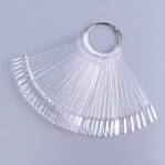Веерная палитра - самый удобный формат для демонстрации оттенков гель-лаков, баз и различных дизайнов.С помощью веерной палитры клиент сможет не только рассмотреть многообразие цветов и дизайнов, но и примерить их на свои ногти, просто приложив понравившийся оттенок. Это позволит увидеть клиенту, как оттенок смотрится на коже, а также с легкостью подобрать разные гармоничные сочетания.Палитра рассчитана на 50 цветов. Все образцы скреплены плотным и крепким кольцом, которое гарантирует долговечное использование.Все образцы в палитре имеют форму миндаль - одну из самых распространенных у клиентов. Цвет образцов - прозрачный, наиболее приближенный к естественным ногтям. Так, при нанесении различных гель-лаков и баз на такие образцы вы сможете увидеть их в деле, рассмотреть консистенцию, плотность пигментированность.
