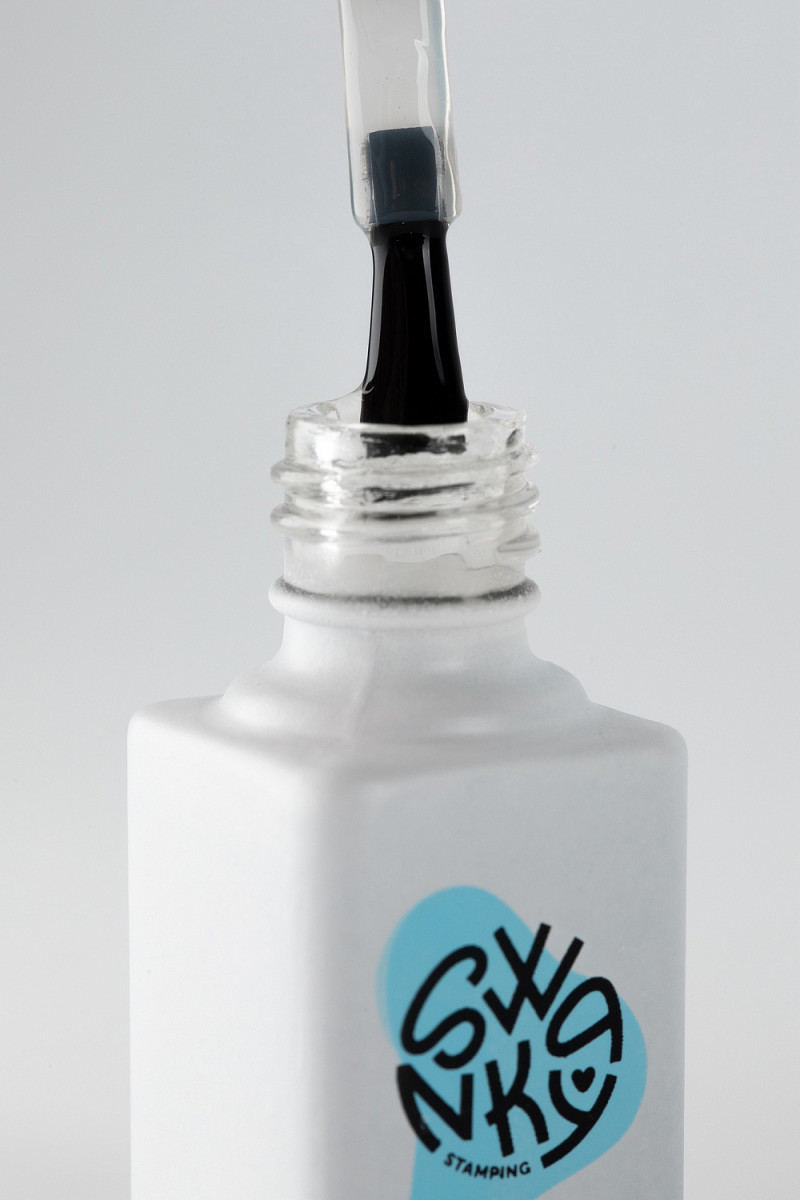 Лак с липким слоем поможет сделать качественный дизайн при работе с фольгой, пигментами, втирками и стемпингом!Техника работы прозрачным лаком с липким слоем:1. Подготовьте ногтевую пластину и подложку для дизайна. С цветного гель-лака необходимо снять дисперсию. 2. Поверхность ногтя лучше забафить. 3. Нанесите прозрачный лак на пластину и перенесите рисунок штампом на ноготь как обычный цветной лак для стемпинга. 4. Подождите от 10 до 30 секунд в зависимости от толщины линий, чтобы лак немного подсох. 5. Липкости лака достаточно, чтобы работать с втиркой, фольгой или пигментом на комфортной скорости. 6. Зафиксируйте дизайн топом. Рекомендуем использовать для финишного покрытия топ для стемпинга Swanky Stamping