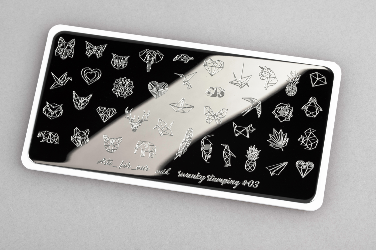 Стемпинг — это стильный дизайн ногтей в три движения руки. Для того, чтобы ваш дизайн получился идеально, необходимы качественные материалы для стемпинга: пластина, штамп, скрапер и лаки. Пластина для стемпинга Arti for you with Swanky Stamping 03 отличается от других производителей тончайшей гравировкой, которая позволяет без проблем перенести на ногти даже самый сложный с виду рисунок.Стильная геометрия будет актуальной всегда, а эти геометрические или векторные изображения никого не оставят равнодушным.