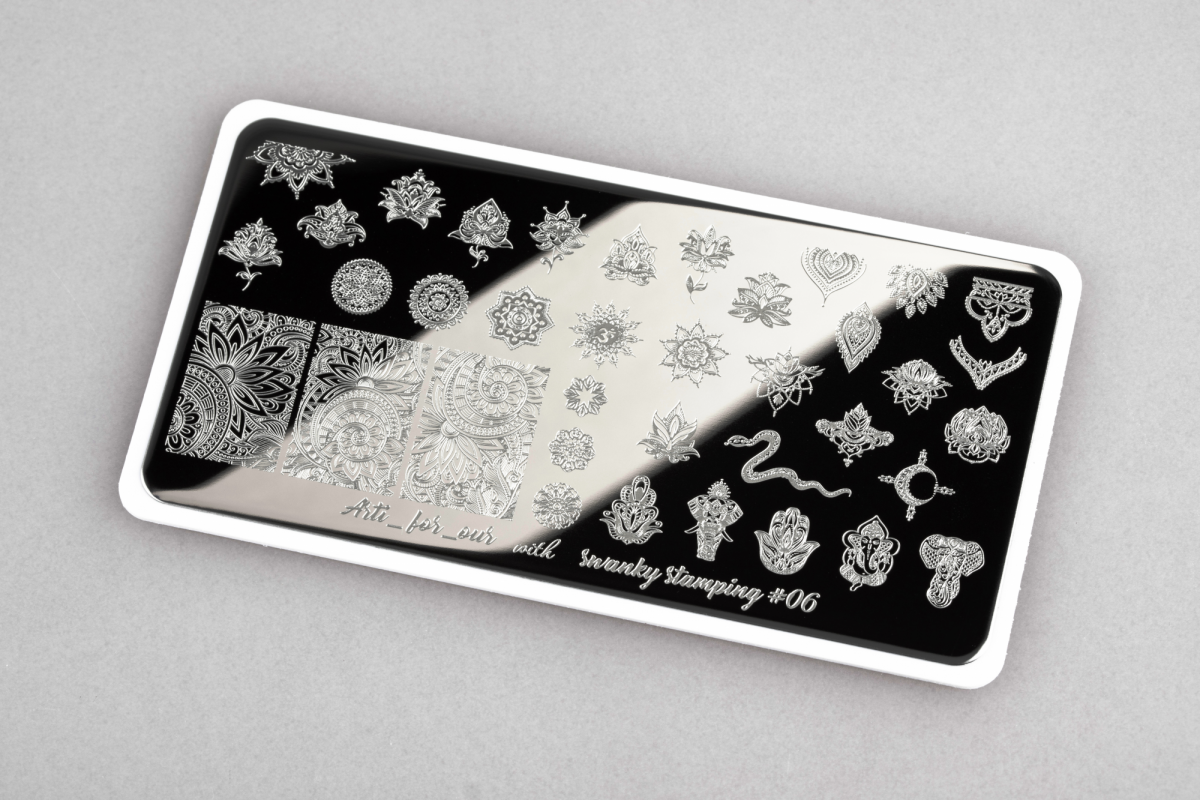 Стемпинг — это стильный дизайн ногтей в три движения руки. Для того, чтобы ваш дизайн получился идеально, необходимы качественные материалы для стемпинга: пластина, штамп, скрапер и лаки. Пластина для стемпинга Arti for you with Swanky Stamping 06 отличается от других производителей тончайшей гравировкой, которая позволяет без проблем перенести на ногти даже самый сложный с виду рисунок.Намасте! Для гармонии и позитивной энергии была создана эта пластина, которая идеально подойдет для маникюра не только йогам, но и всем, кому она близка по духу. А те, кто не нашел свой рисунок на пластине 05, могут поискать его здесь и какой-нибудь узор точно откликнется в вашей душе.