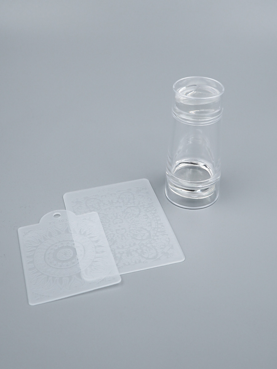 Удобный инструмент для переноса рисунка с пластины на ноготь. Две силиконовые подушечки разного диаметра, их легко снять, каждая закрывается крышкой. Сквозь прозрачную конструкцию подушек будет видно, как переносится рисунок на штамп и ложится на поверхность ногтя. Штамп выполнены из высококачественного силикона, который отлично забирает рисунок с пластины и до мельчайшей детали переносит его на ноготь. Штамп легко повторяет форму ногтя и изгиб, за счет чего отпечаток рисунка будет четким. Штамп комфортно лежит в руке, без труда очищается с помощью обезжиривателя или средства для снятия лака. Его не нужно предварительно бафить. Также, в комплект вложен пластиковый скребок для лака.Длина инструмента (с крышками) - 6,6 смДиаметр большой подушечки - 2,8 смДиаметр малой подушечки - 2,3 смРазмеры скребков: 7х5 см и 5,4х4,2 см