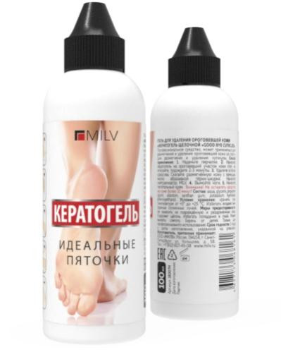 Кератогель щелочной «GOOD BYE CUTICLES» для НОГгель для удаления ороговевшей кожиСредство применяется для удаления ороговевшего слоя кожи, натоптышей на пятках и подошвах стоп, а также для профилактики образования кожных наростов. При регулярном применении снижает необходимость проведения процедуры педикюра.Способ применения:для обработки небольших натоптышей 1. Наденьте перчатки. 2. Нанесите небольшое количество средства на ватный диск и приложите его к ороговевшему участку пятки или ступни. Подождите 2-3 минуты. 3. Снимите ватный диск с кожи и аккуратно скатайте размягченную кожу с помощью мелко абразивной тёрки-шкурки или пемзы. Нанесите нейтрализатор MILV. 4. Удалите остатки средства. 5. Нанесите питательный крем для ног.для обработки стопы 1. Наденьте перчатки. 2. Нанесите средство на ороговевший участок кожи стоп, не втирайте, подождите 2-3 минуты. 3. Удалите остатки средства. Скатайте размягчённую кожу с помощью абразивной тёрки-шкурки. Нанесите нейтрализатор MILV. 4. Вымойте ноги. 5. Нанесите питательный крем для ног.Внимание! Не оставлять средство на коже более 10 минут!