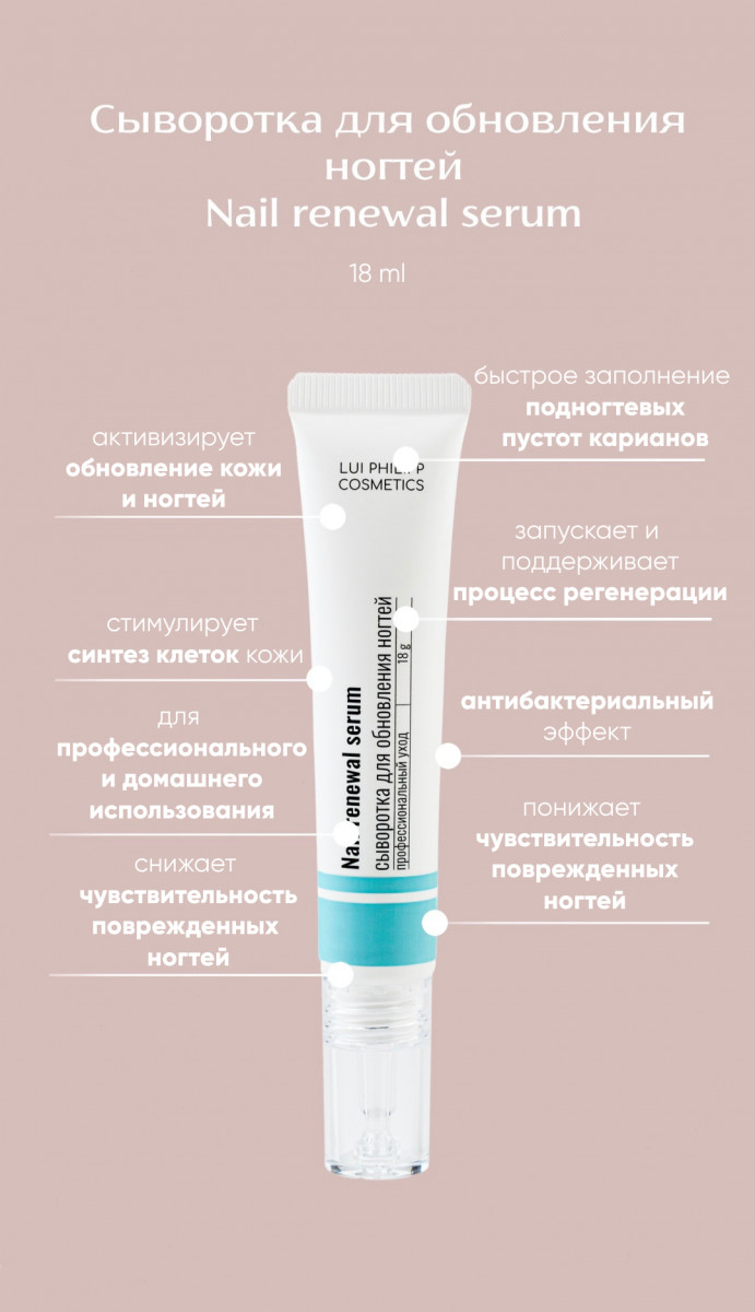 Сыворотка для обновления ногтей Nail renewal serum, 18 млот LUI PHILIPP COSMETICSУдобная упаковка с аппликатором-капельницей значительно помогает экономить сыворотку при нанесении, гарантирует удобство и быстроту нанесения продукта;Экстракт семян сенного пажитника активизирует обновление кожи и ногтей;Сок листьев бульбины кустарниковой стимулирует синтез клеток кожи для быстрого заполнения подногтевых пустот и карманов;Экстракт гриба трутовика сливающегося снижает чувствительность поврежденных ногтей к внешним воздействиям;Ундециленовая кислота и антибактериальный компонент O-cymen-5-ol предотвращают развитие грибковых инфекций;Инновационный продукт не имеющий аналогов на рынке.Содержит ингредиенты доказательной базы(Действие доказано компаниями Rahn (Германия), Symrise (Германия), Nikkol (Япония);