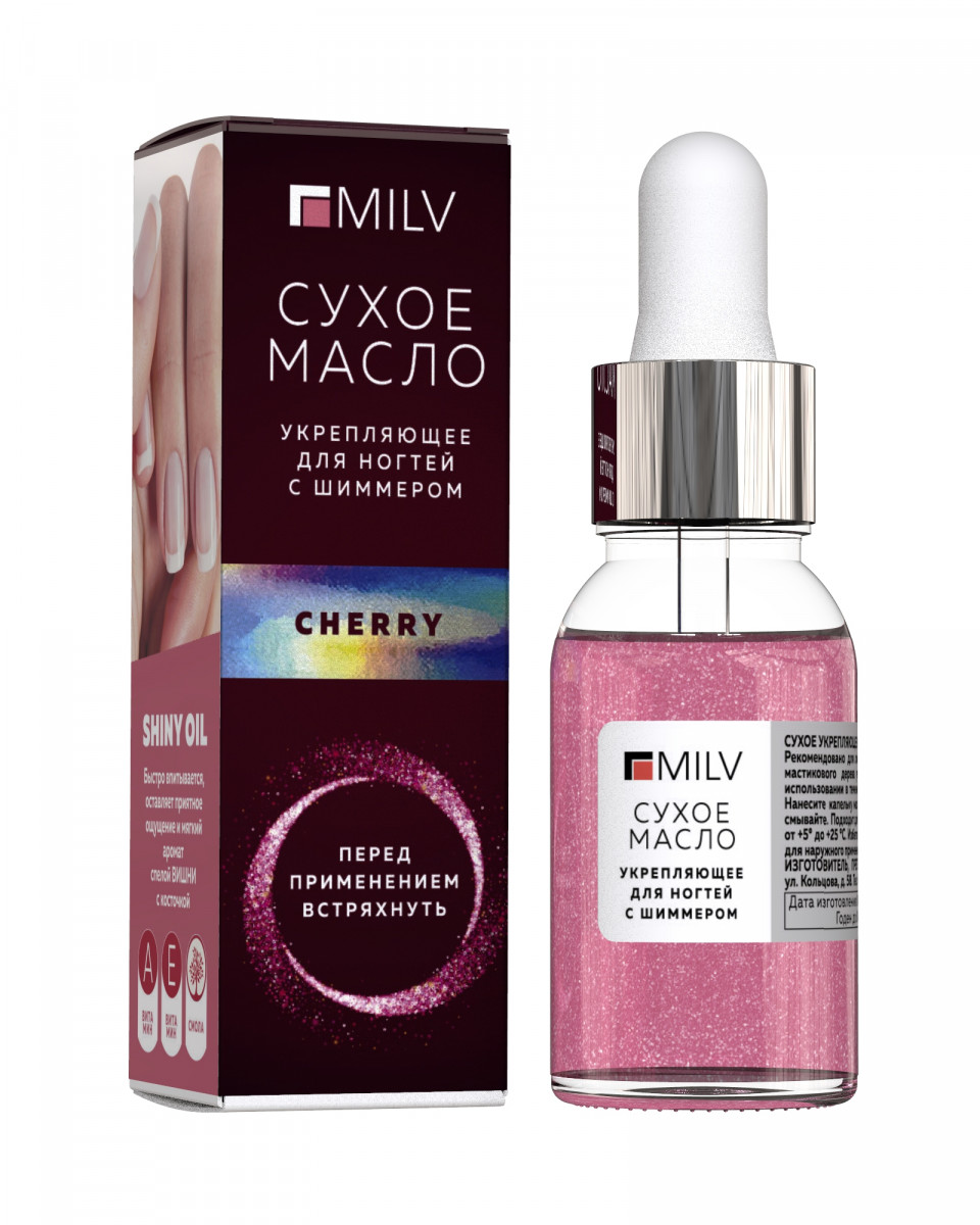 Сухое укрепляющее масло для ногтей с шиммером «Cherry»Масло приятно наносить на кожу. Лёгкая консистенция обеспечивает быстрое и глубокое впитывание, оставляя на коже бархатистое ощущение. Благодаря специально разработанной формуле масло защищает от сухости, питает, придаёт рукам ухоженный вид, при этом не оставляет липких следов, жирного блеска и ощущения плёнки.Блестящий уход и обогащение:смола мастикового дерева в составе средства повышает прочность ногтей при ежедневном использовании в течение 1 месяцаЯркий аромат вишни поднимает настроениемелкие частицы придают коже мерцающее сияниеСпособ применения: встряхните флакон перед применением. Нанесите капельку масла на ноготь. Массажными движениями вотрите в зону ногтя и кутикулы. Не смывайте. Подходит для ежедневного использования.