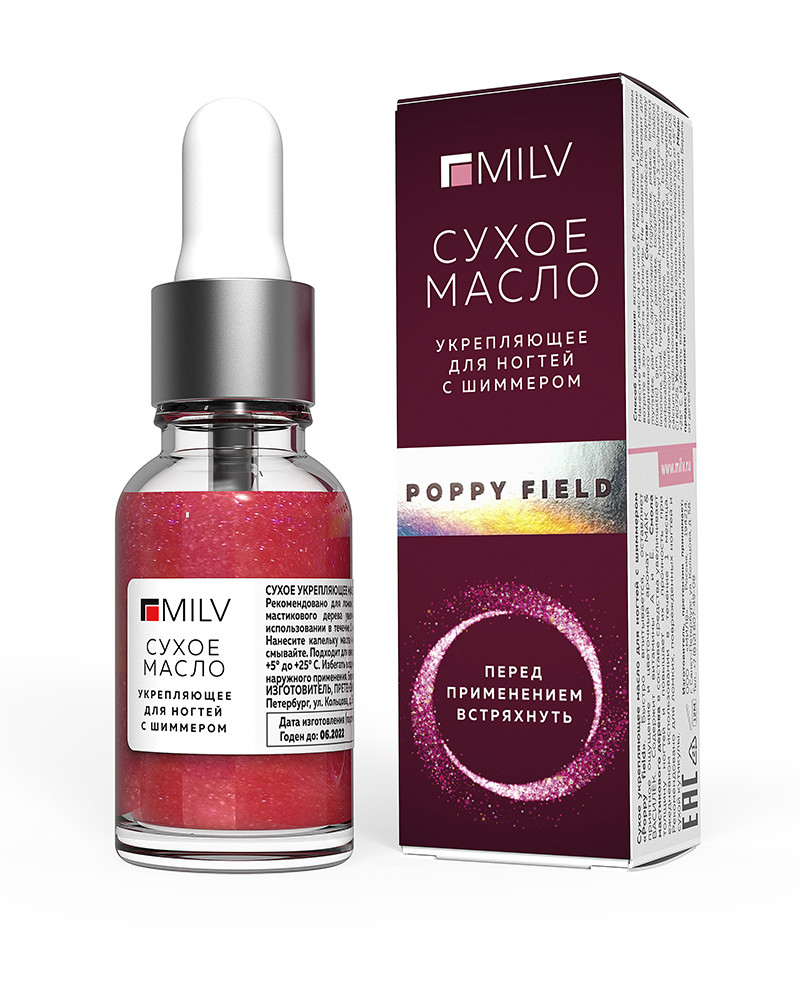 Сухое укрепляющее масло для ногтей с шиммером «POPPY FIELD»Масло приятно наносить на кожу. Лёгкая консистенция обеспечивает быстрое и глубокое впитывание, оставляя на коже бархатистое ощущение. Благодаря специально разработанной формуле масло защищает от сухости, питает, придаёт рукам ухоженный вид, при этом не оставляет липких следов, жирного блеска и ощущения плёнки.Блестящий уход и обогащение:смола мастикового дерева в составе средства повышает прочность ногтей при ежедневном использовании в течение 1 месяцасвежий аромат полевых цветов МАК&ВАСИЛЁК поднимает настроениемелкие частицы придают коже мерцающее сияниеСпособ применения: встряхните флакон перед применением. Нанесите капельку масла на ноготь. Массажными движениями вотрите в зону ногтя и кутикулы. Не смывайте. Подходит для ежедневного использования.Состав: isododecane, isopropyl myristate, parfum, caprylic/сapric triglyceride, pistacia lentiscus (mastic) gum, retinyl palmitate, tocopheryl acetate, linalool, limonene, citral, hydroxycitronellal, hydroxyisohexyl 3-cyclohexene carboxaldehyde, octocrylene, homosalate, butyl methoxydibenzoyl methane, helianthus annuus seed oil, phenoxyethanol, calcium sodium borosilicate, titanium dioxide, tin dioxide, СI 26100, СI 60725.