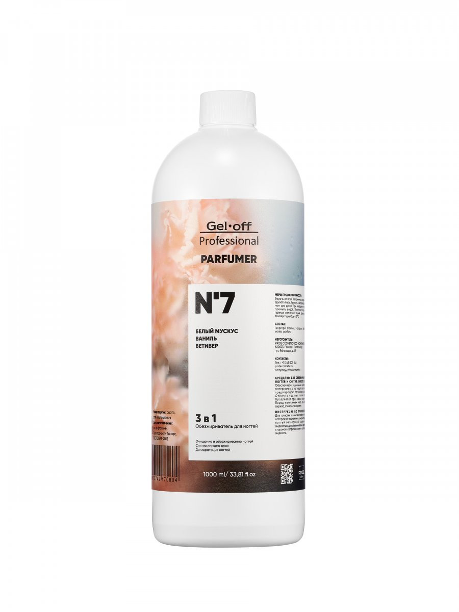 Обезжириватель для ногтей 3 в 1 GEL-OFF PARFUMER № 7 (белый мускус, ваниль, ветивер), 1000 мл.Парфюмированный обезжириватель из линейки PARFUMER - это незаменимое средство для обработки ногтей перед покрытием.Обезжириватель обеспечивает идеальное сцепление материалов с ногтевой пластиной, предотвращает отслоения и сколы. Отлично удаляет липкий слой. Продлевает срок носки покрытия. Используется перед нанесением лака, гель-лака, акрила, стемпинга, акригеля.Аромат нового обезжиривателя напоминает знаменитый Miss Dior Cherie. Весенний аромат, который несет в себе необычайную свежесть, ее можно сравнить с росой на прекрасных цветах весной. Этот аромат благоухает так, словно все вокруг распускается и расцветает.В аромате сочетаются ноты белого мускуса, пачули, нероли, ванили, жасмина, бергамота, цветов апельсина, ветивера и розы.Уход за ногтями превращается в сеанс ароматерапии.