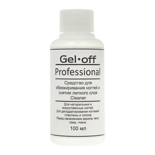 Линейка Gell Off Professional идеальна для использования мастерами маникюра и педикюра.Эффективный состав из активных очищающих и смягчающих (масло Е, касторовое масло) компонентов позволяет тщательно, но бережно очищать ногти. Средства подходят для работы с любыми системами декорирования и эффективно удаляют покрытие разного вида.Средство для обезжиривания ногтей и снятия липкого слоя.Подходит для натуральных и искусственных ногтей.Для дегидратирования ногтевой пластины и типсов.Применяется перед нанесением акрила, геля, лака.Рекомендации по применению:Для очистки ногтей осторожно промокните поверхность всех ногтей чистой безворсовой салфеткой, смоченной жидкостью для снятия липкого слоя, обратной стороной салфетки снимите остаточную жидкость.