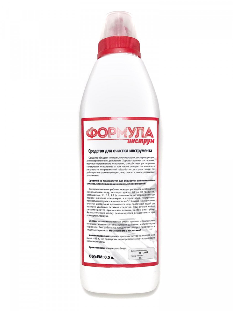Средство для очистки инструмента.Средство обладает моющим, смачивающим, диспергирующим, антикоррозионным действием.Хорошо удаляет застарелые, прочные органические отложения, способствует растворению кальциевых отложений, в том числе очищает от налетов в результате неправильной обработки дезсредствами.Не действует на хром-никелевую сталь, стекло, эмаль, резиновые уплотнения.СРЕДСТВО НЕ ПРИМЕНЯЕТСЯ ДЛЯ ОБРАБОТКИ АЛЮМИНИЯ И ЕГО СПЛАВОВ, ОЛОВЯННЫХ И ОЦИНКОВАННЫХ ПОВЕРХНОСТЕЙ.Для приготовления рабочих моющих растворов необходимо использовать воду, температура от 40 до 90 градусов, соотношение 1:1, 1:2, 1:3 (в зависимости от загрязнения) где первое значение концентрат, а второе вода.Инструмент полностью погружается в емкость на 5-15 минут.По окончанию очистки инструмент промывается под проточной водой до полного удаления остатков средства.При ручной мойке рекомендуется применять ветошь, щетку или губку.Автоматическую мойку рекомендуется осуществлять при помощи ультразвука.